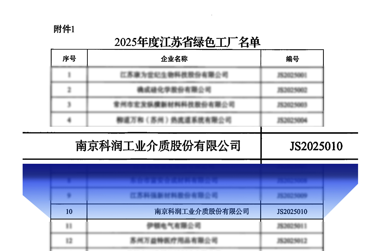近日,江苏省工业和信息化厅正式公布2025年度省级绿色工厂认定名单,南京科润工业介质股份有限公司(以下简称“科润”)凭借在绿色制造领域的系统性实践与突出成效,成功斩获“2025年度江苏省绿色工厂”称号,这一殊荣标志着企业在用地集约化、原料无害化、生产洁净化、废物资源化及能源低碳化方面的综合实力获得省级权威认可。