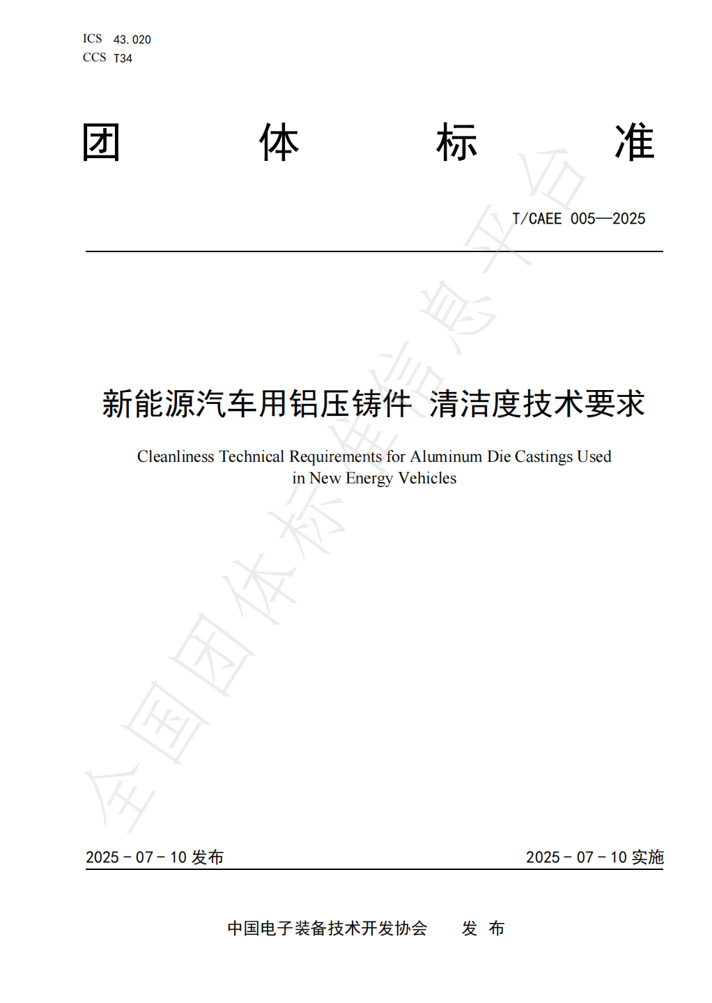 近日,由中国电子装备技术开发协会发布并实施的团体标准 T/CAEE 005—2025《新能源汽车用铝压铸件 清洁度技术要求》 正式发布实施。